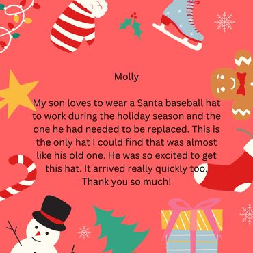 Love this cap. It will work great for Christmas in July. Fun and made well.